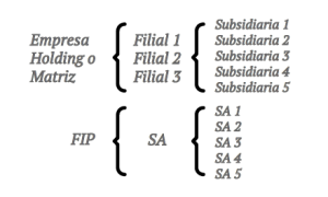 Siguiendo el contexto explicado de Filial y Subsidiaria de Empresa, así como el ejemplo trazado, la FIP sería en adelante la PJM, bajo quien estaría el control, la dirección y administración de la SA filial), y también de las SA subsidiarias (SA1, SA2, SA3, SA4 y SA5). En este contexto, la PJM FIP sería la propietaria de las Acciones de la SA filial, y ésta a su vez sería la propietaria de las Acciones de las SA subsidiarias (1, 2, 3, 4 y 5).
